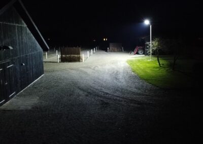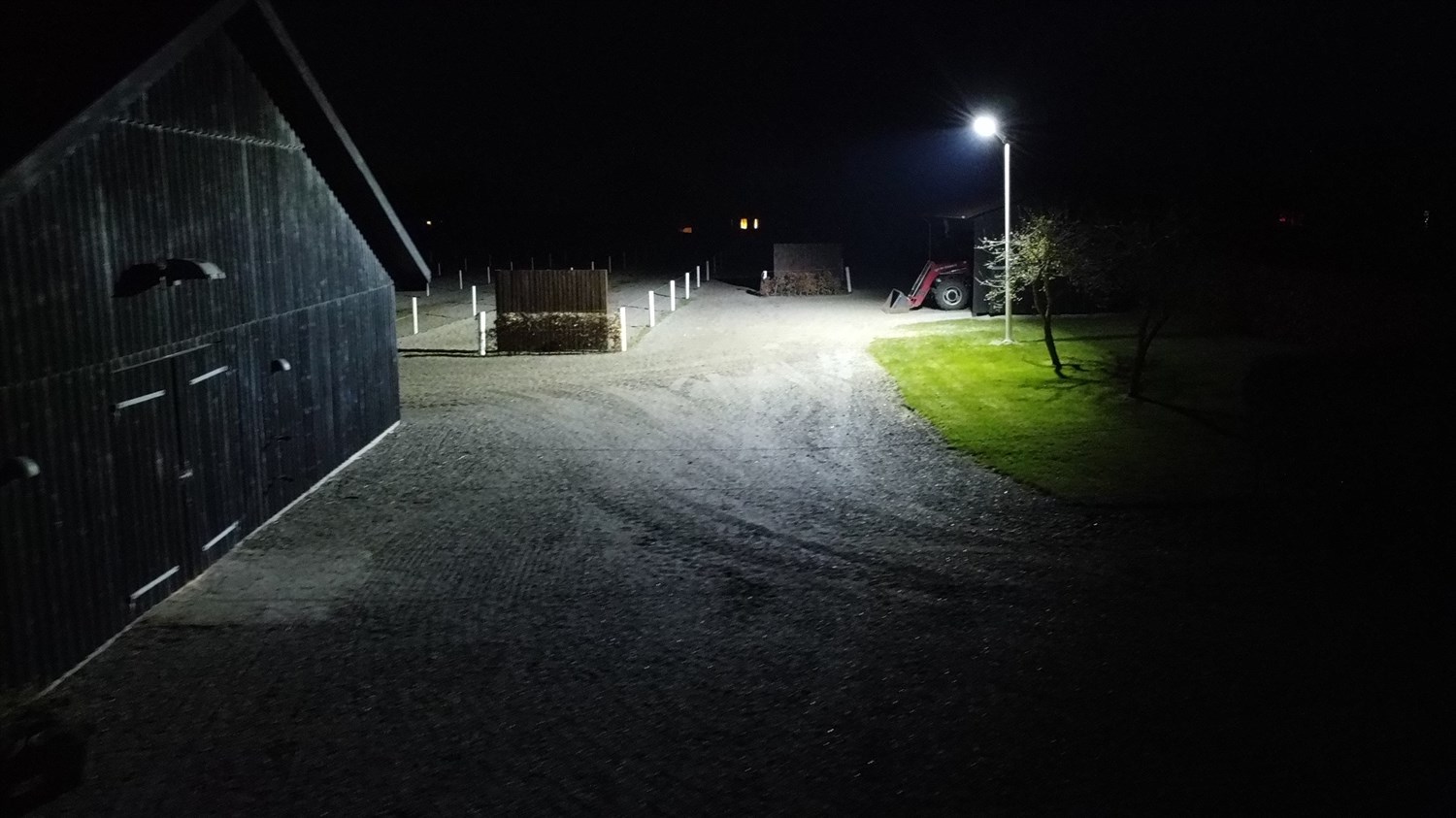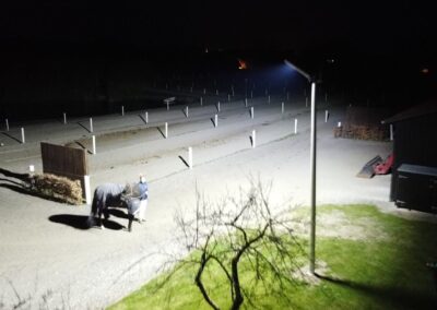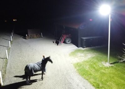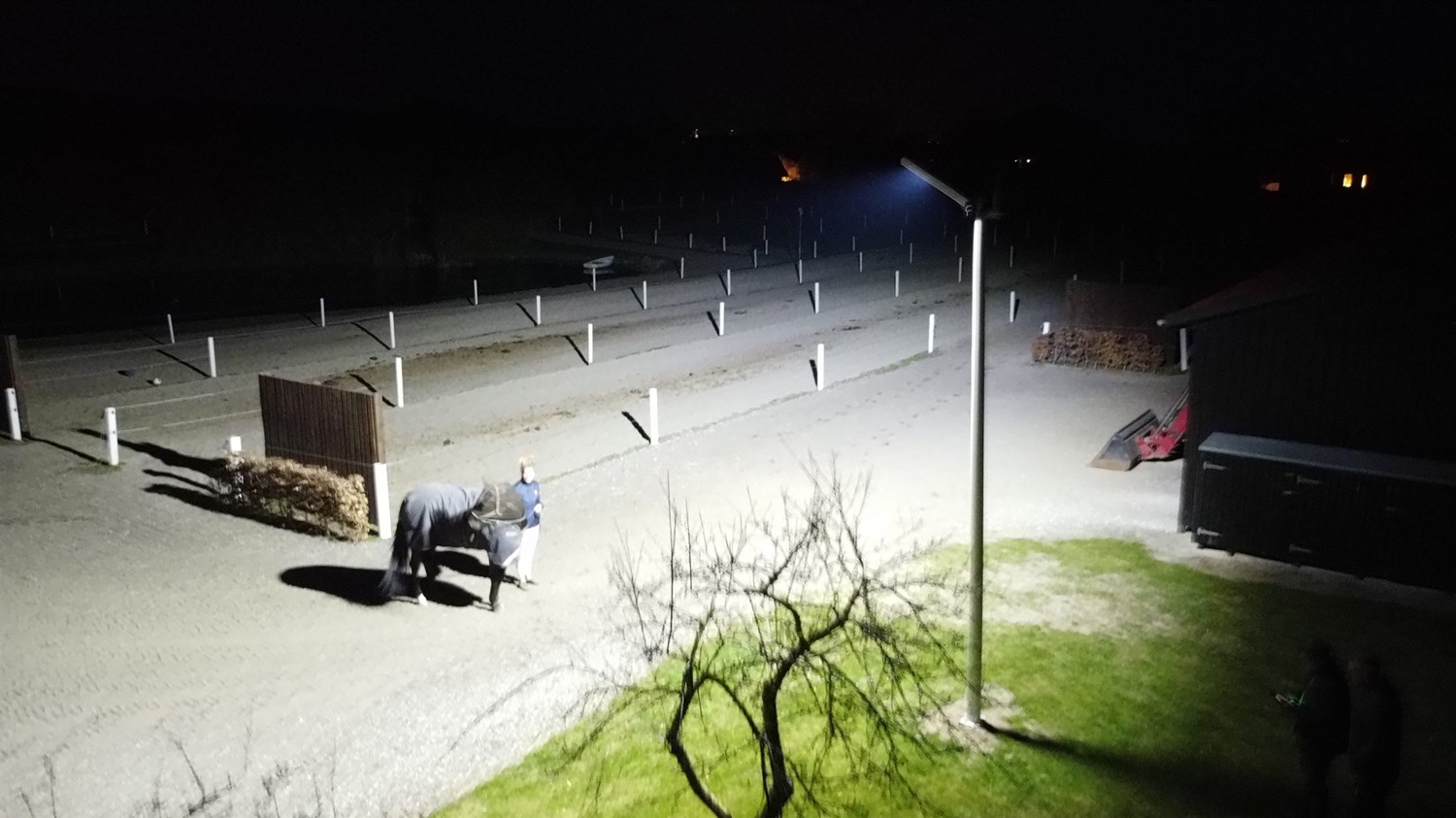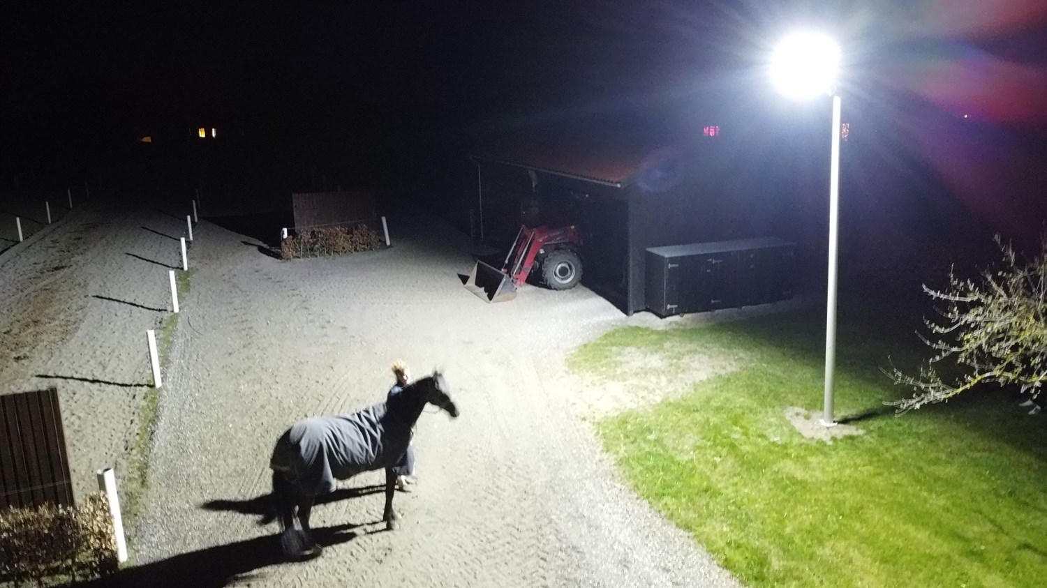 Det som har været det helt fantastiske i de mørke måneder , er at lampen let har kunne producere strøm nok via panelet eller med den medfølgende vindturbine, så mit behov har været dækket fuldt når jeg skulle bruge lyset til eksempelvis at trække hestene på fold, eller kom sent hjem om aftenen med heste som havde været til væddeløb, osv.